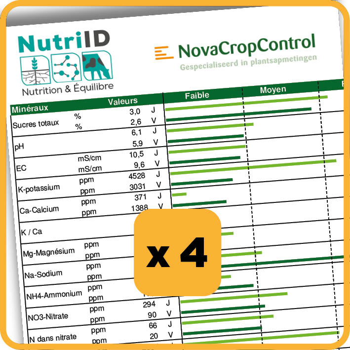 4 étiquettes Nova Crop Control,4 sachets d’échantillonnage, un protocole pour l’expédition, 4 étiquettes avec l’adresse du laboratoire à coller sur les enveloppes pour l’expédition des échantillons.